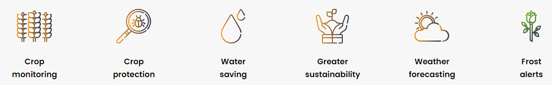 Ολοκληρωμένο και προηγμένο σύστημα για αγροκτήματα, συνεταιρισμούς και οργανώσεις παραγωγών που επιδιώκουν να ελέγξουν το κόστος παραγωγής και να αυξήσουν τις αποδόσεις των καλλιεργειών, με κάλυψη που εκτείνεται σε χιλιάδες εκτάρια. Γύρω από έναν κεντρικό σταθμό με βασικούς αισθητήρες καιρού και κλίματος, τοποθετούνται πολλαπλές ασύρματες μονάδες IoT—μέχρι 8 χιλιόμετρα μακριά— εξοπλισμένες με μικροκλιματικούς αισθητήρες για τη μέτρηση της υγρασίας του εδάφους, της θερμοκρασίας και των συνθηκών καλλιέργειας.